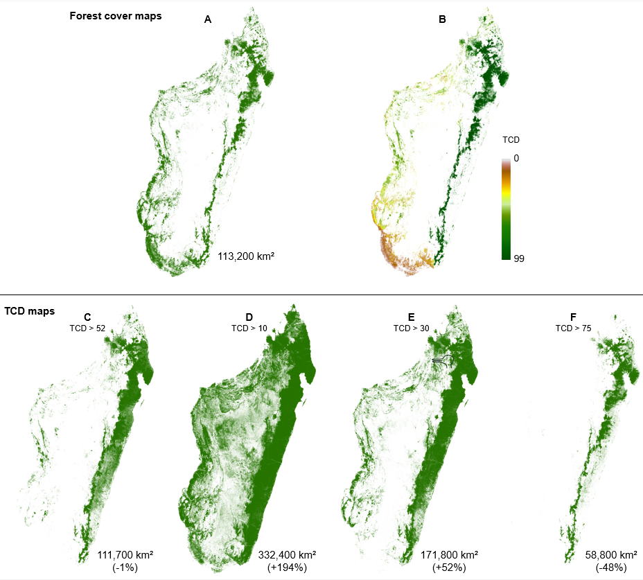 Natural forest cover in Madagascar (year 2000) and its relationship to tree canopy density (TCD) thresholds. A: Independent baseline natural forest cover for 2000; B: Same forest cover map as A with pixel-level TCD values assigned; C: Tree cover extent after applying the optimal TCD threshold producing an area estimate closest to the true natural forest extent; D–F: Tree cover area when applying standard TCD thresholds, with total area estimates showing either overestimation or underestimation of tree cover. These maps also reveal major geographic misalignment— particularly in dry forest regions — highlighting the need for locally adapted thresholds.