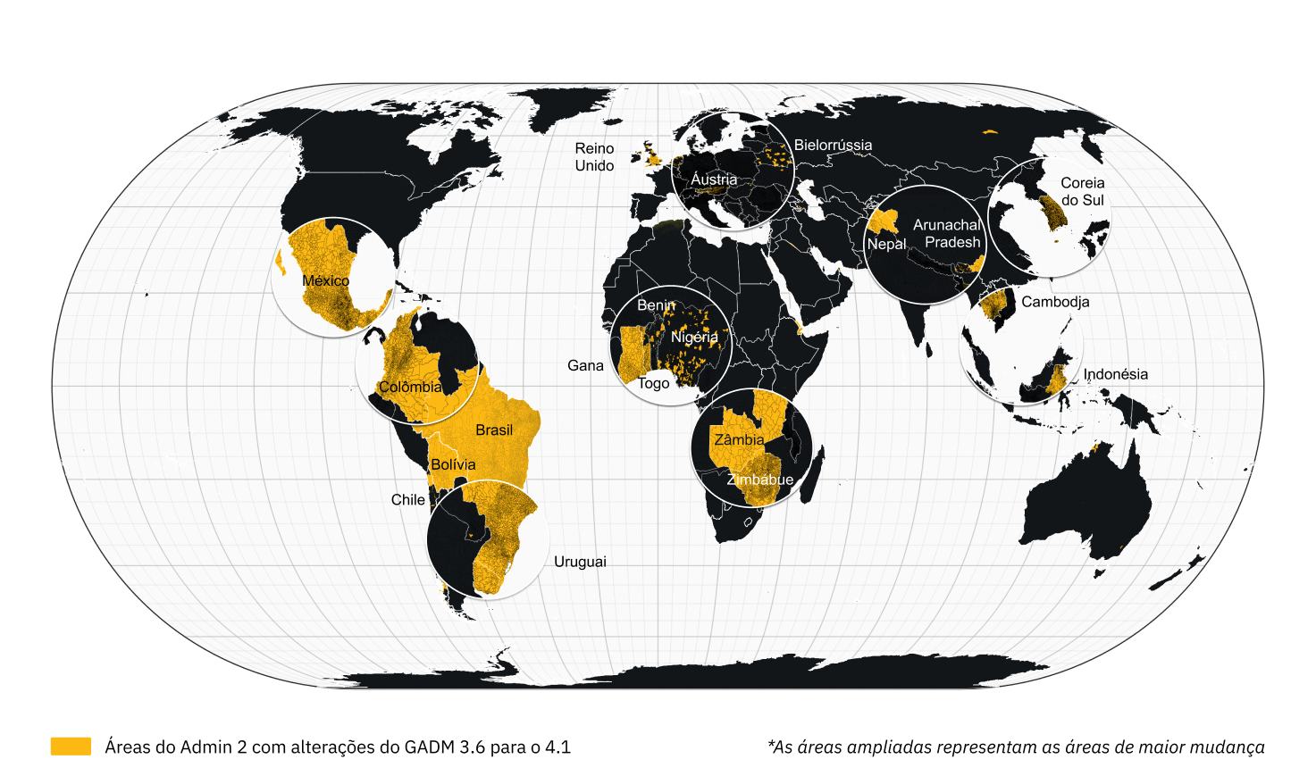 Em nível subnacional, observamos algumas alterações em nomes, códigos de identificação e/ou fronteiras, especialmente na África Ocidental e Austral, América Central, América do Sul, Europa e Sudeste Asiático. As áreas destacadas do mapa abaixo mostram as áreas amarelas do admin 2 que foram alteradas: